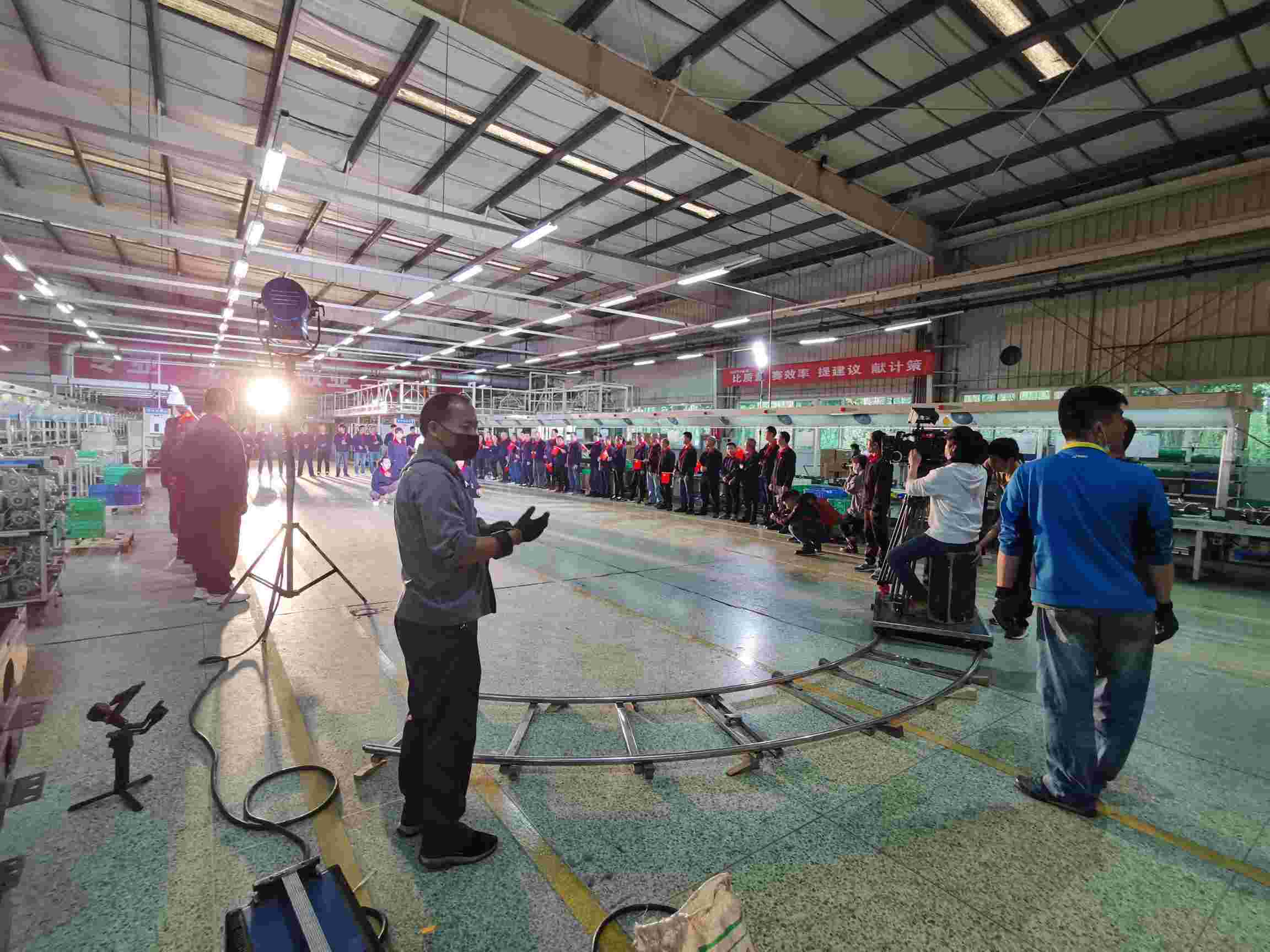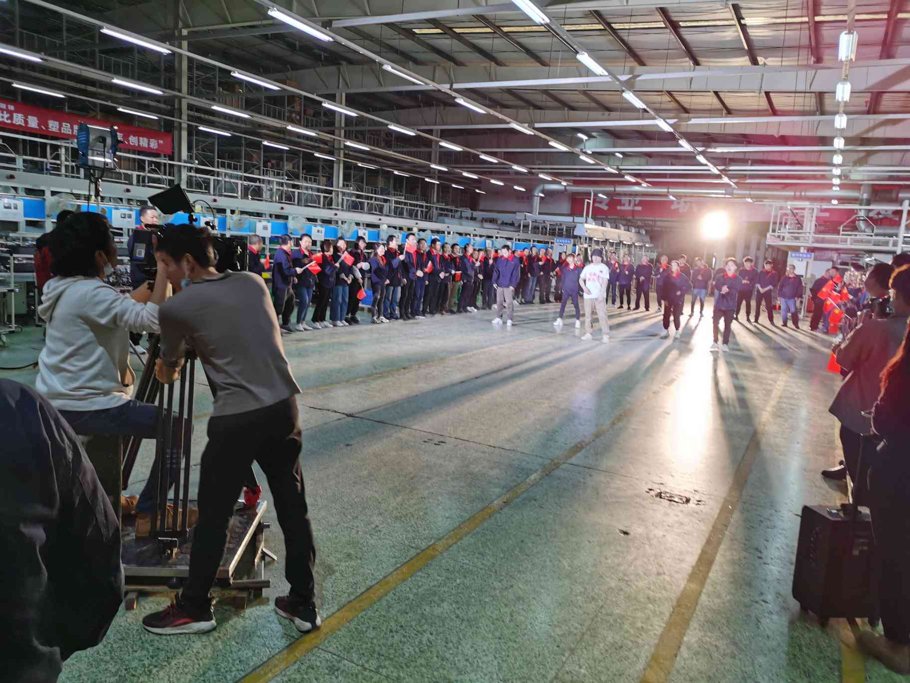 《贊歌獻給黨》MV攝制組走進前鋒集團西區產業園,拍攝在這里拉開序幕。“跑得再整齊一點”“大家的表情再舒展一些”……身著工作服的近20位青年,手舉旗幟,闊步奔跑——這是拍攝中的一個場景。本次拍攝共有三個室內場景,一個室外場景,參與的職工有近百名,為了呈現出最好的畫面效果,參與人員反復溝通、調整,有不少鏡頭至少拍了六七次。
