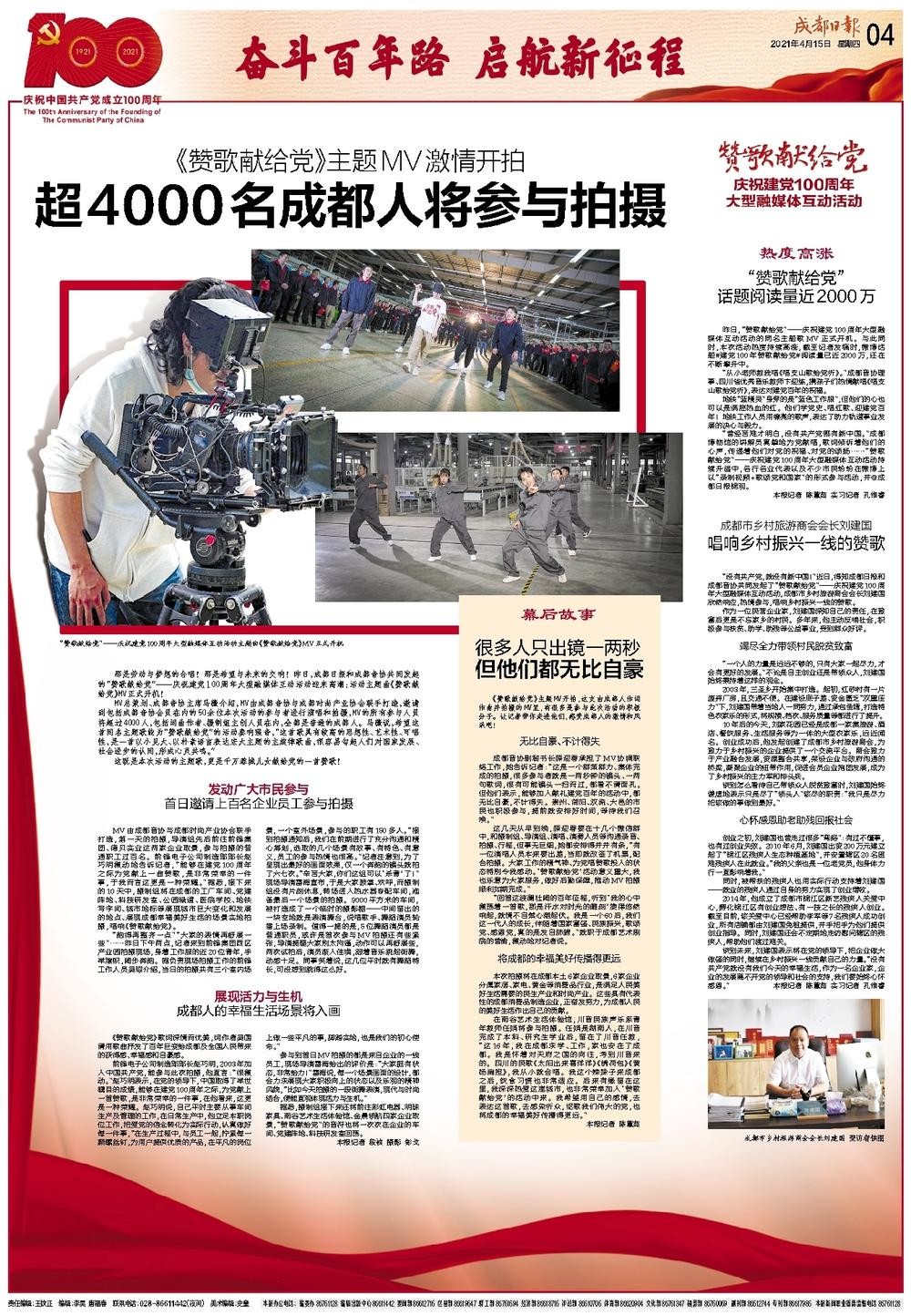 那是勞動與夢想的合唱!那是希望與未來的交響!在春回大地的時節,成都日報和成都市音協共同發起的“贊歌獻給黨”——慶祝建黨100周年大型融媒體互動活動也迎來高潮:活動主題曲《贊歌獻給黨》MV在前鋒集團西區產業園開機!充滿朝氣、朗朗上口的旋律,將從這一刻開始在城市的上空回蕩。