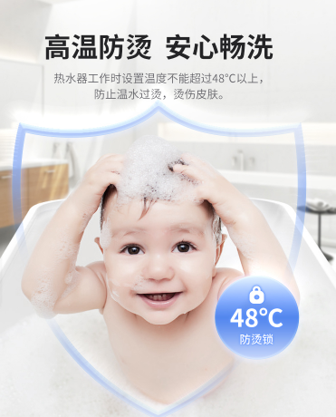 斷電再啟,溫度依舊;48℃防燙鎖,確保老人和小孩安全暢洗;四重呵護,保障全家遠離細菌,享受健康舒適的熱水生活。