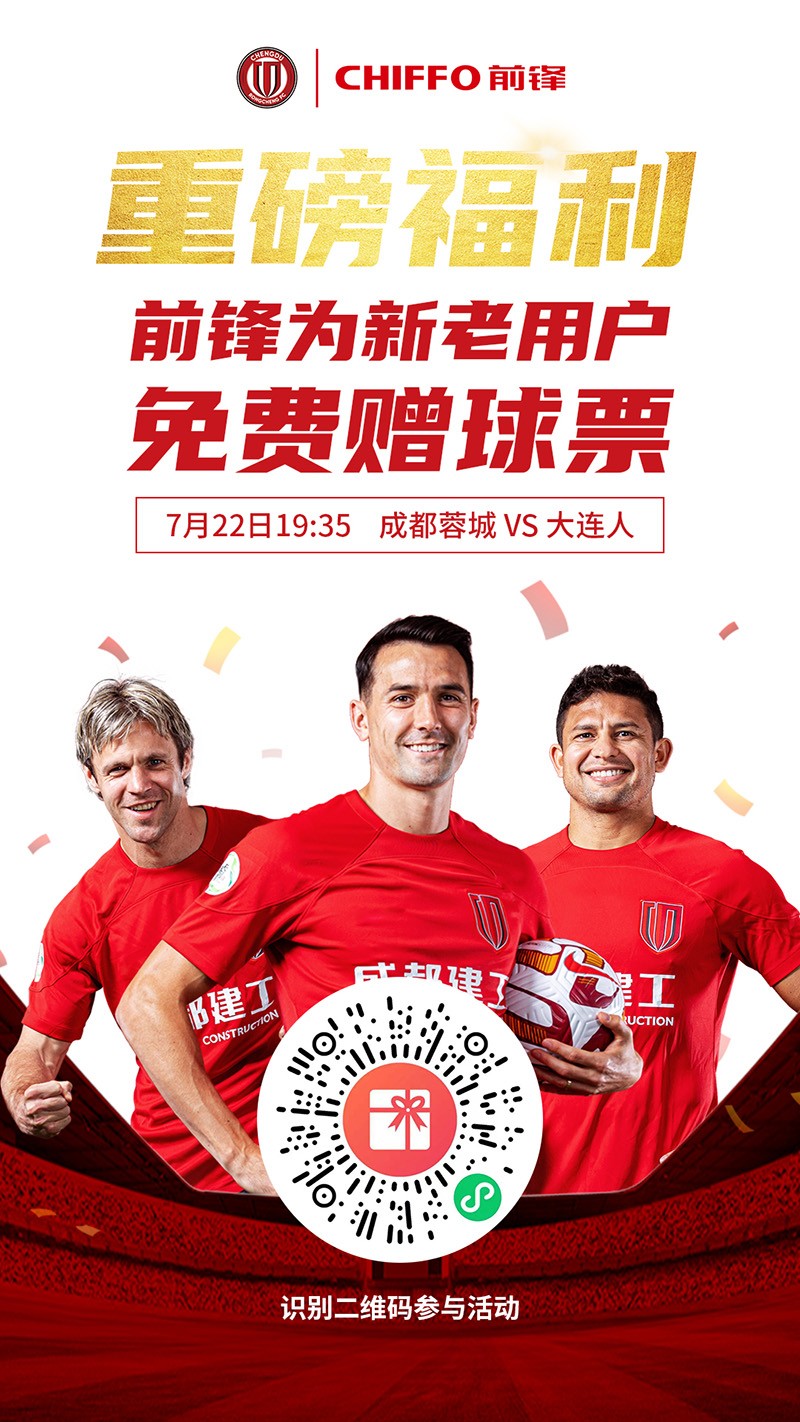 沒有抽到球票的朋友們,別遺憾也別著急,接下來才是重磅消息:贊助期間,前鋒將在每次成都蓉城主場比賽前,開啟贈球票福利活動,只要參與我們的活動,就有機會加入前鋒觀賽團,感受最嗨的足球現場!